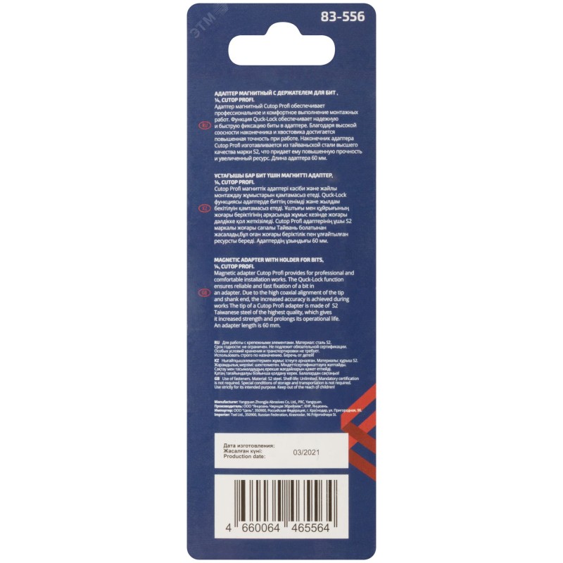 Адаптер магнитный Cutop Profi обеспечивает профессиональное и комфортное выполнение монтажных работ. Функция Quck-Lock обеспечивает надежную и быструю фиксацию биты в адаптере. Благодаря высокой соосности наконечника и хвостовика достигается повышенная точность при работе. Наконечник адаптера Cutop Profi изготавливается из тайваньской стали высшего качества марки S2, что придает ему повышенную прочность и увеличенный ресурс. Длина адаптера 60 мм. Упаковка - блистер.