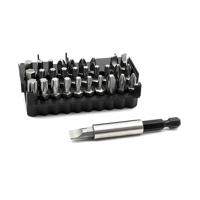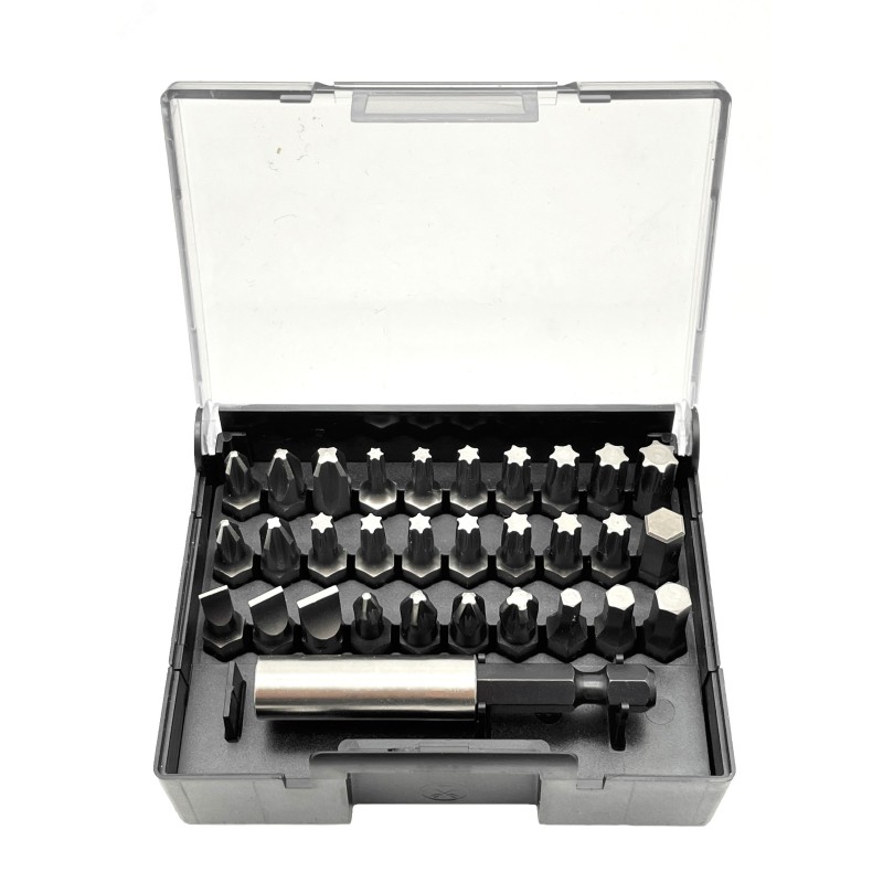 - Комплектация:30 бит C6,3 x 25 мм/ SL 4,5 x 0,6 / 5,5 x 0,8 / 6,5 x 1,2 PH 1 - 2 шт / PH 2 - 2 шт / PH 3 PZ 1 / PZ 2 - 2 шт / PZ 3 Hex 3 мм / 4 мм / 5 мм / 6 мм Torx 10 / Torx 15 / Torx 20 - 5 шт / Torx 25 - 4 шт / Torx 27 / Torx 30 / Torx 40, Битодержатель E6,3 x 58 мм, Пластиковый кейс