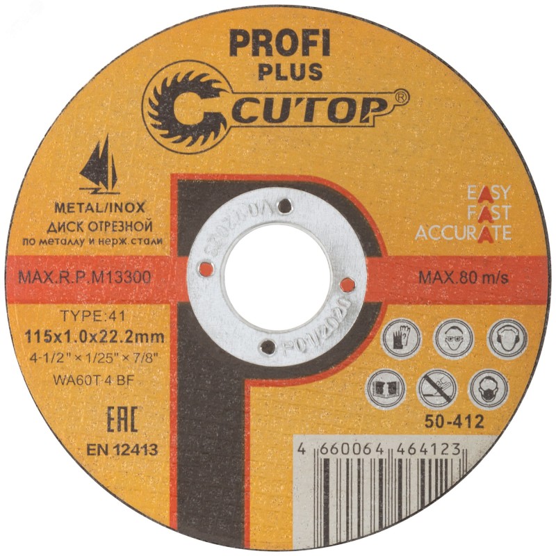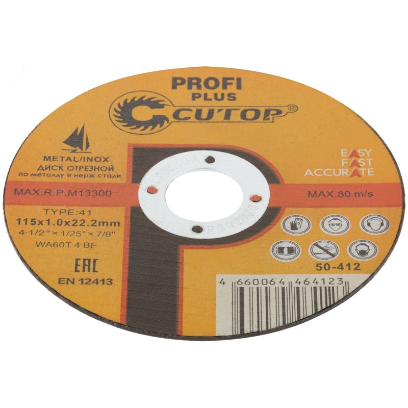 CUTOP Profi PLUS. Использованы уникальные технологии производства. Профессиональный отрезной диск для промышленного использования на основе монокристаллического электрокорунда, который улучшает КПД диска и позволяет увеличить количество резов в несколько раз. Предназначен для резки металла и н нержавеющей стали. Для углошлифовальных машин. Посадочный диаметр 22,2 мм.