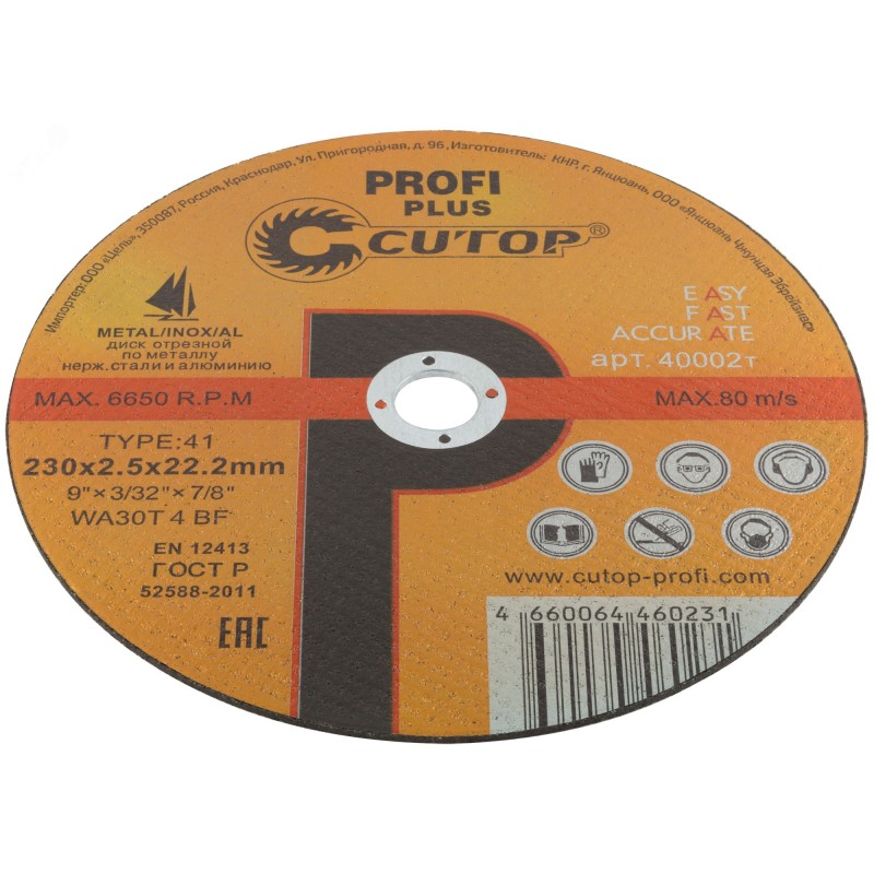 Профессиональный отрезной диск по металлу, нержавеющей стали и алюминию Cutop Profi Plus предназначен для промышленного использования. Применяется с УШМ для резки сталей и различных сплавов. Монокристаллический электрокорунд, входящий в состав диска, многократно увеличивает КПД диска.