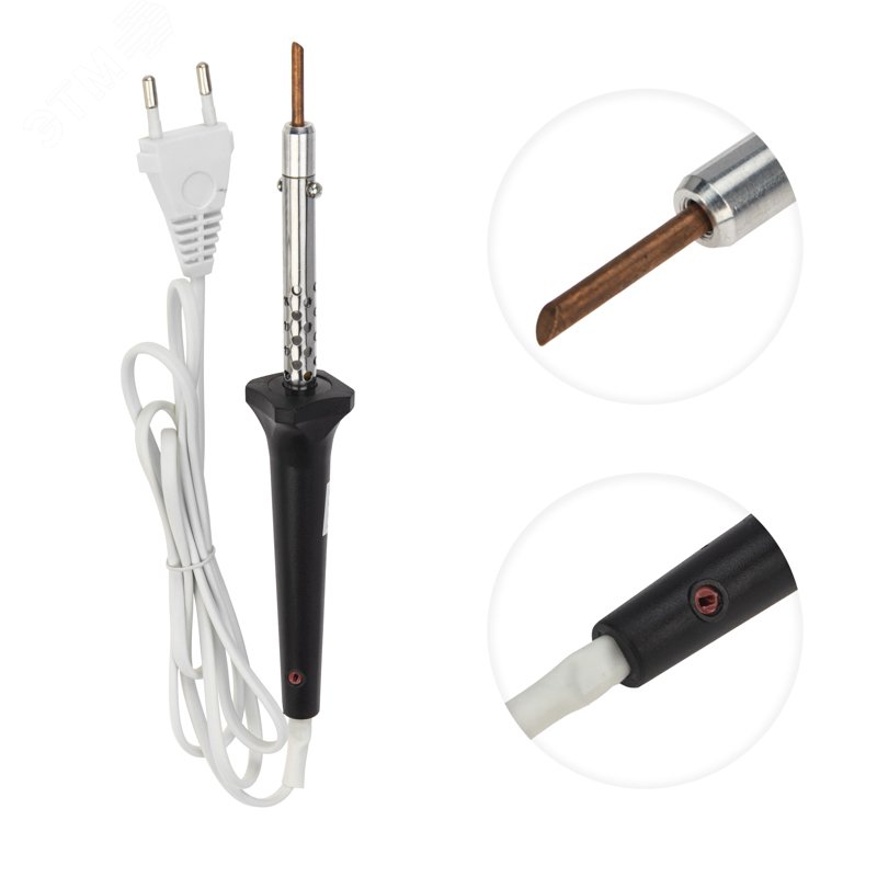 - Преимущества:Подходит для любительского и профессионального использования|Удобная скошенная форма жала|Жало можно заменить в случае необходимости|Керамический нагреватель быстро прогревает жало|Удобная термостойкая рукоятка из пластика