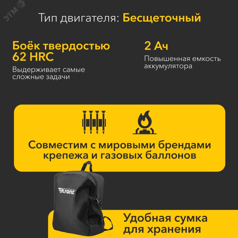 - Преимущества:Увеличенный ресурс сопла - закалка по современным технологиям|Боёк твердостью 57 HRC выдерживает самые сложные задачи|Два аккумулятора 2 Ач - работайте дольше без перерыва на подзарядку|Надежные контроллер и электродвигатель - увеличенный срок службы инструмента|Обработка цилиндров на ЧПУ - плавная работа без сбоев и заклинивания поршня|Быстросъемные насадки в комплекте для работы с разным крепежом