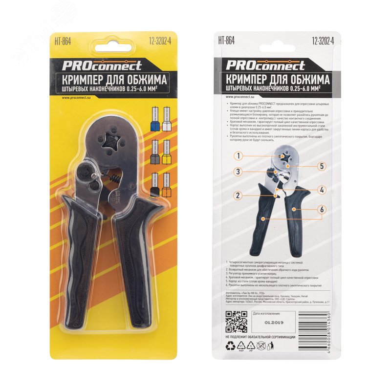 Кримпер PROconnect HT-864 предназначен для обжима штыревых наконечников в диапазоне 0.25-6.0 мм2. Корпус выполнен из высокопрочной закаленной инструментальной стали (сплав хрома и ванадия) и имеет закругленные линии корпуса для удобства и безопасного использования. Четырехсегментная саморегулирующая матрица с системой поворотных кулачков диафрагменного типа.Клещи имеют настройку давления опрессовки и принудительно размыкающуюся блокировку, которая не позволяет разойтись рукояткам до полной опрессовки, т. е. контролирует качество контактного соединения.Храповой механизм, гарантирует полный цикл качественной опрессовки.Рукоятки выполнены из плотного синтетического покрытия с резиновыми вставками, благодаря которому руки не будут скользить.