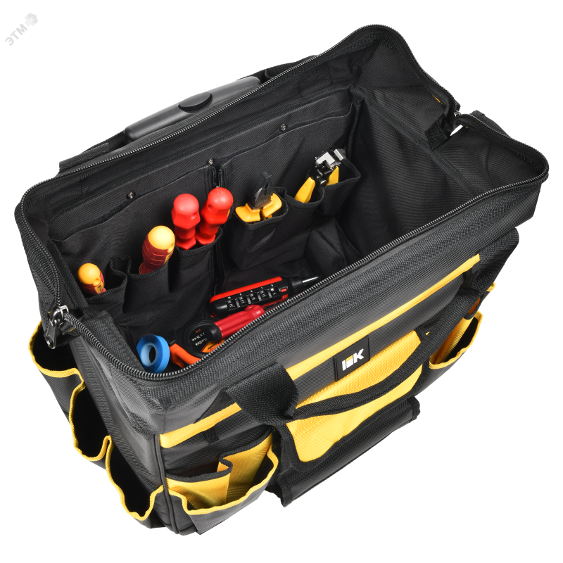 - Преимущества:Материал: полиэстер 600D Оксфорд.|Жесткое дно с резиновыми ножками.|Тканевая ручка и наплечник с анатомической вставкой.|Большой основной отдел с 3 карманами и креплением для рулетки.|Переднее откидное отделение с 16 карманами.|Заднее откидное отделение с 6 карманами, в т.ч. карман для документов.|2 боковых кармана с клапаном.|Усиленная молния с широкими звеньями.