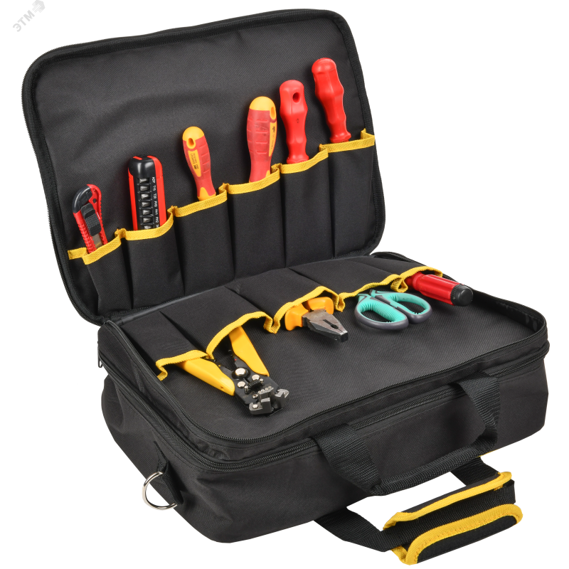 - Преимущества:Материал: полиэстер 600D Оксфорд.|Жесткое дно с резиновыми ножками.|Тканевая ручка и наплечник с анатомической вставкой.|Большой основной отдел с 3 карманами и креплением для рулетки.|Переднее откидное отделение с 16 карманами.|Заднее откидное отделение с 6 карманами, в т.ч. карман для документов.|2 боковых кармана с клапаном.|Усиленная молния с широкими звеньями.