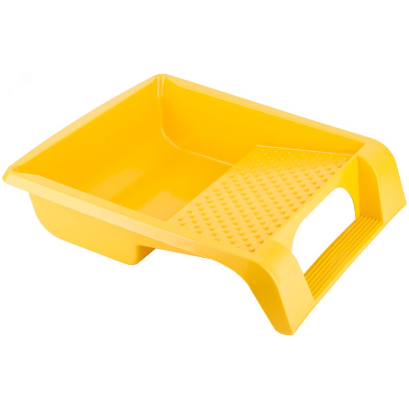 Для равномерного нанесения краски на валик. Легко очищается от старой краски. Конструкция включает в себя наличие педали, для возможности удерживания ванночки ногой и предотвращения ее передвижения во время раскатки валика. Материал – пластик.
