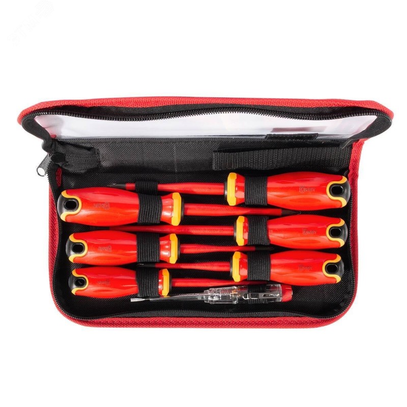 Для работ под напряжением до 1000 В. Утопленная в лезвие отвертки изоляция делает возможным монтаж винтов с глубокой посадкой. Материал стержня: сталь S2. Материал изоляции стержня: полипропилен. Трехкомпонентная эргономичная рукоятка с мягкими вставками из термопластрезины. Маркировка по типу профиля на торце рукояток. Специальная форма рукоятки с защитой от скатывания и отверстием для подвешивания. Намагниченные вороненые наконечники. Упаковка: кофр на молнии с прозрачной крышкой