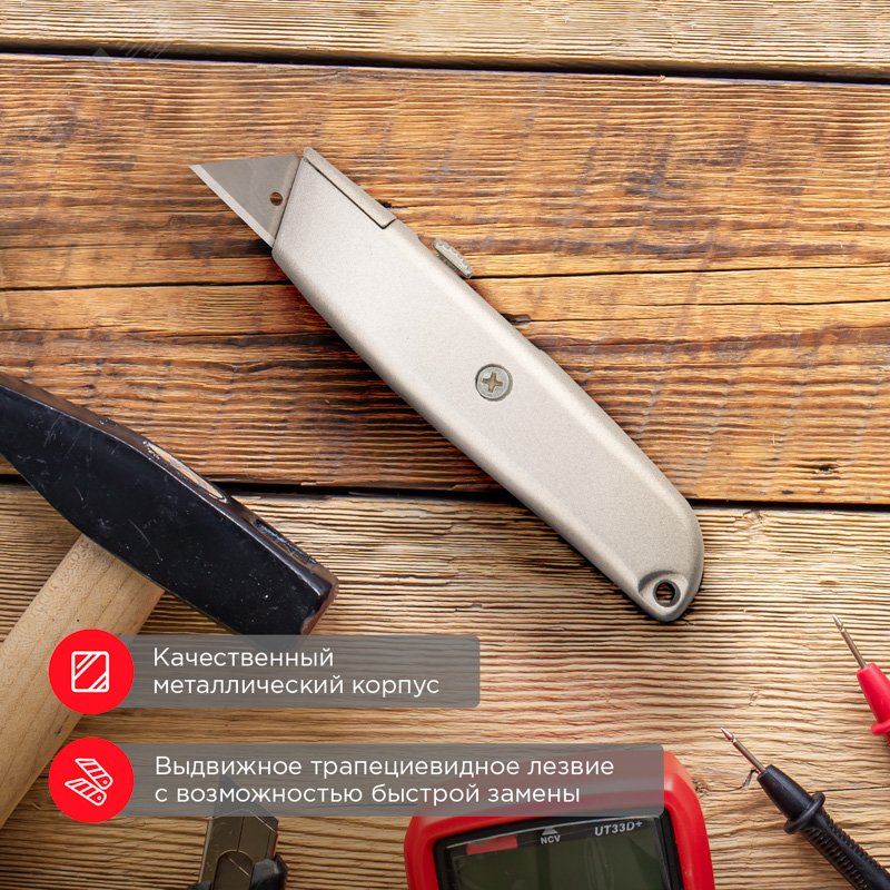 - Преимущества:Долговечный корпус из металла|Лезвие изготовлено из инструментальной стали|Быстрая и простая замена лезвия|Встроенная функция блокировки лезвия