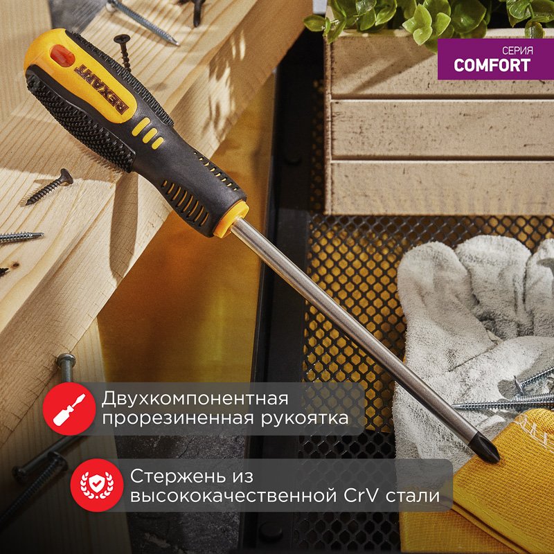 Металлические части инструмента обладают высокой прочностью|Удобные двухкомпонентные противоскользящие рукоятки|Намагниченный наконечник отвертки надежно удерживает крепеж