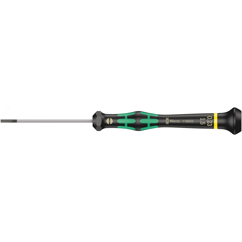- Преимущества:Шлицевая отвёртка Kraftform Micro|Многокомпонентная ручка Kraftform Micro для быстрого и эргономичного завинчивания|С защитой от перекатывания и подвижной головкой для скоростного вращения|Наконечник Wera Black Point обеспечивает точность работы и оптимальную защиту от коррозии|С индикатором Take it easy - Цветовая маркировка профиля и гравировка размера