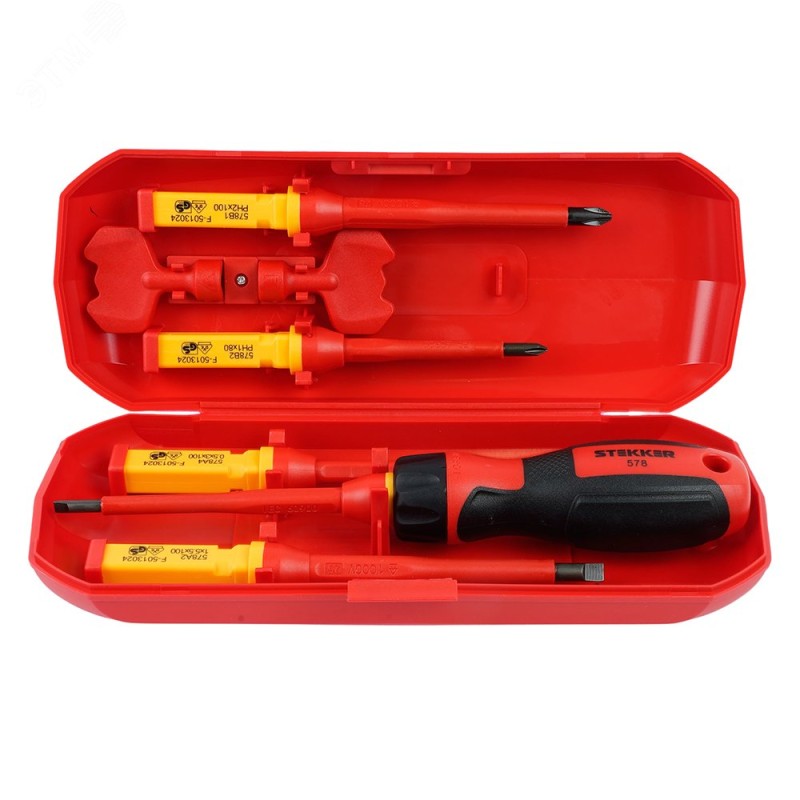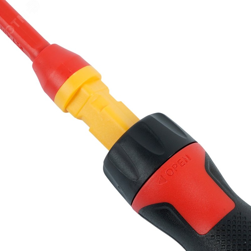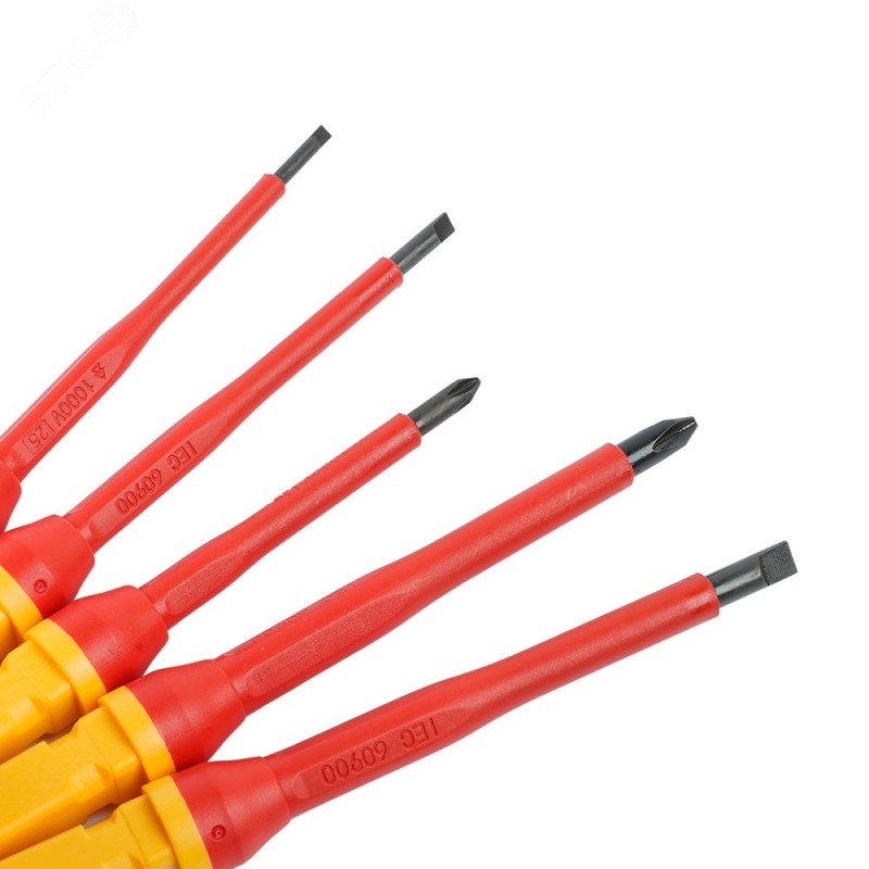 Диэлектрическая отвертка со сменными насадками предназначена для безопасного электромонтажа и обслуживания оборудования под напряжением до 1000 В (переменного тока). Она защищает мастера от удара током благодаря изолированному покрытию стержней и ручке, а сменные насадки обеспечивают универсальность для работы с разными типами крепежа (шлиц, крест и др.)