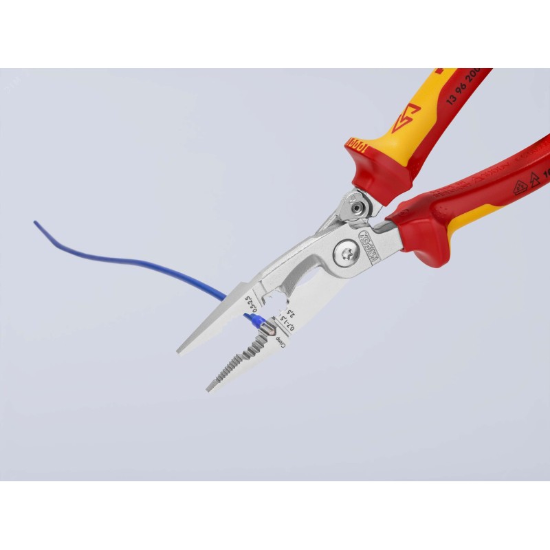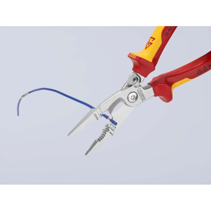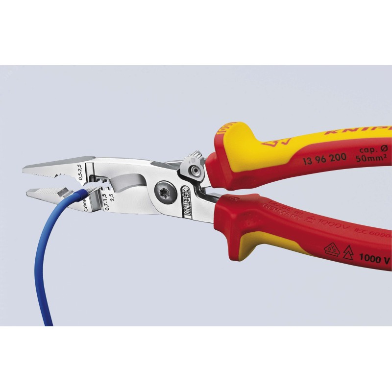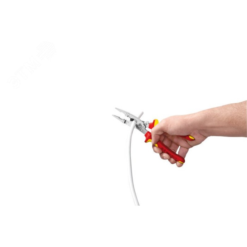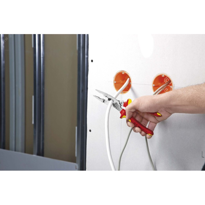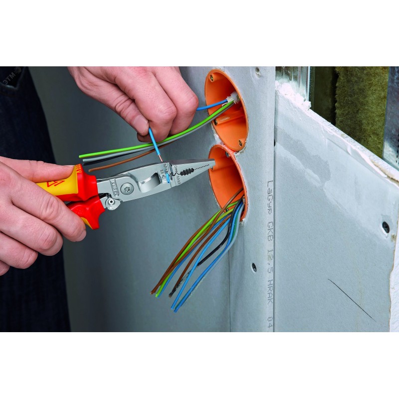 - Дополнительная информация:Mногофункциональные клещи для электромонтажных работ. Для захвата плоского и круглого материала, гибки, удаления заусенцев, резки кабеля, удаления изоляции и опрессовки контактных гильз. 6 функций в одних клещах. Винтовой шарнир: точный ход без люфта. Узкая конструкция облегчает доступ к детали. Гладкие губки для захвата отдельных жил без их повреждения. Профилированные губки и выемка для захвата плоского и круглого материала. Специальная наружная кромка на губке для обработки штепсельных розеток для скрытой проводки и удаления заусенцев на отверстиях для ввода кабеля. Удаление изоляции с проводов 0,75 – 1,5 мм2 и 2,5 мм2. Опрессовочное гнездо для контактных гильз 0,5 – 2,5 мм2. Ножницы с прецизионными лезвиями (индуктивной закалки) для резки медного и алюминиевого кабеля до 5 x 2,5 мм2 / 15 мм. Инструмент с креплением для страховки от падения с высоты Специальная инструментальная сталь