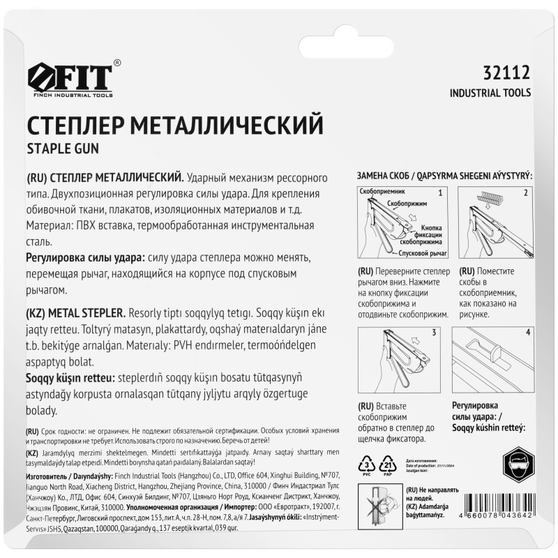 Для скоб ''Тип 53''. Ударный механизм рессорного типа. Двухпозиционная регулировка силы удара. Для закрепления обивки мебели, укрепления плакатов, закрепления проволочной сетки и строительства теплиц. Используется со скобами 31304-31314, 31404-31414, 31361-31365. Материал - инструментальная сталь, ПВХ вставка. Упаковка - блистер.