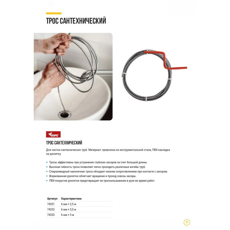 Для чистки сантехнических труб. Высокая гибкость троса позволяет легко проходить различные изгибы труб. Спиралевидный наконечник троса обладает низким сопротивлением при контакте с засором. Формованная рукоятка облегчает вращение и проход сквозь засоры. Противоскользящее ПВХ покрытие.