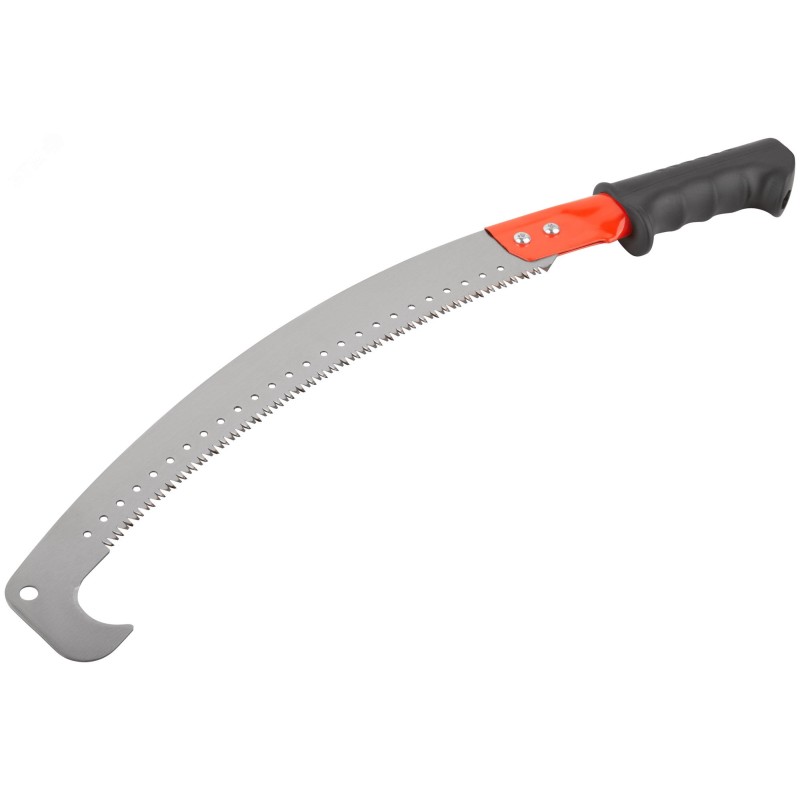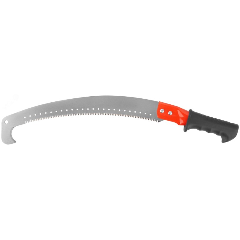 Ножовка садовая с секачом FIT IT предназначена для пиления древесины твердых и мягких пород, в том числе сырой. Высокочастотная закалка зубьев повышает их износостойкость. Трехгранная заточка улучшает эффективность реза. Шаг зубьев 6 TPI обеспечивает высокую скорость реза. Острозаточенный секач позволяет быстро и эффективно срезать ветки диаметром до 8 мм. Полотно прочно фиксируется на рукоятке с помощью двух болтов. Полая конструкция рукоятки дает возможность дополнительной установки телескопической штанги для работ в труднодоступных местах. Эргономичная форма рукоятки обеспечивает надежный хват. Накладка ПВХ на рукоятке предотвращает проскальзывание инструмента во время работы.