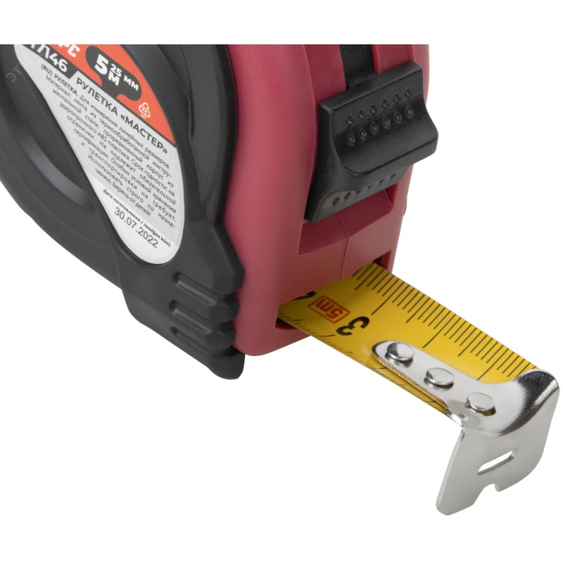 - Преимущества:Крупный размер нанесенной шкалы упрощает считывание показаний|Подвижность зацепа повышает точность измерений|Корпус рулетки изготовлен из ударопрочного abs пластика, устойчивого к механическим воздействиям|Резиновые накладки на корпусе предотвращают повреждения инструмента при падении или ударе|Полимерное покрытие ленты защищает от истирания и коррозии|Рулетку возможно крепить на ремне с помощью металлической клипсы|Резиновый ремешок позволяет носить рулетку на руку или хранить в подвешенном положении