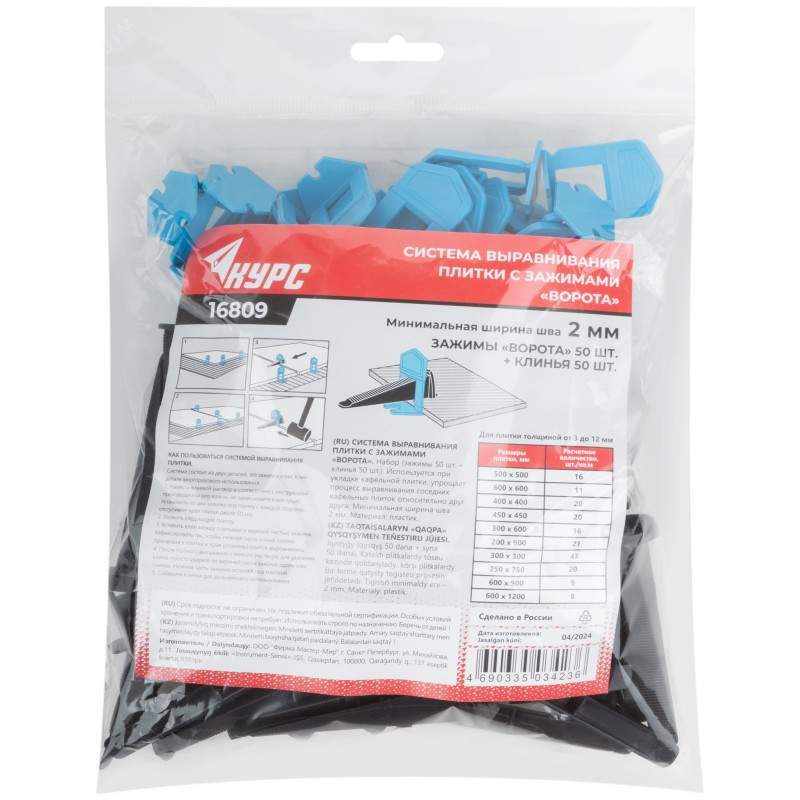 Система выравнивания кафельной плитки с зажимами ''Ворота''. Используется при укладке кафельной плитки, упрощает процесс выравнивания соседних кафельных плиток относительно друг друга. Минимальная ширина шва 2 мм. Материал – пластик. Упаковка – п/э пакет с подвесом.