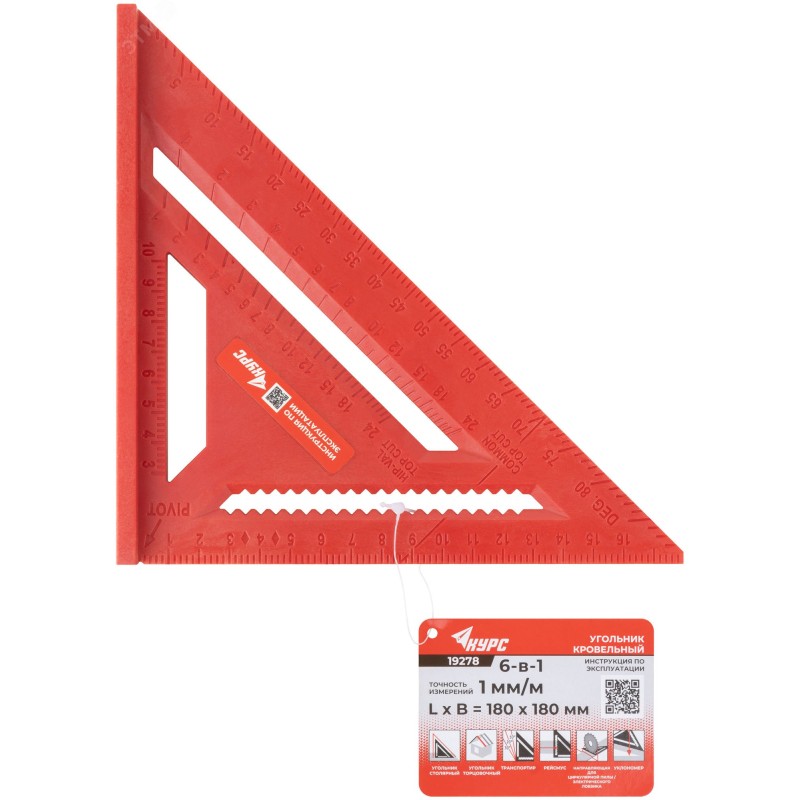 Универсальный. Для различных работ. Штампованная шкала обладает высокой стойкостью к истиранию. Упорный выступ для удобства в работе. Толщина корпуса 6 мм. Варианты применения - угольник столярный, угольник торцовочный (для разметки стропил кровли), транспортир, рейсмус (для создания линий, параллельных краю доски), направляющая для циркулярной пилы/электрического лобзика, уклономер (в случае применения со строительным отвесом). Корпус из ABS пластика устойчив к механическим воздействиям.
