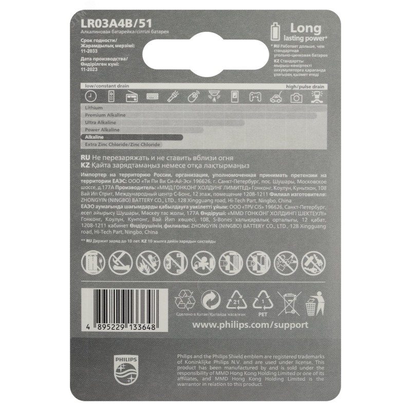 - Преимущества:Отлично подходит для устройств с высоким энергопотреблением|Батарея остается годной для использования в течение 10 лет| Удобство использования|Понятные схематические инструкции по эксплуатации|Щелочные батареи Philips не содержат кадмия, ртути и свинца
