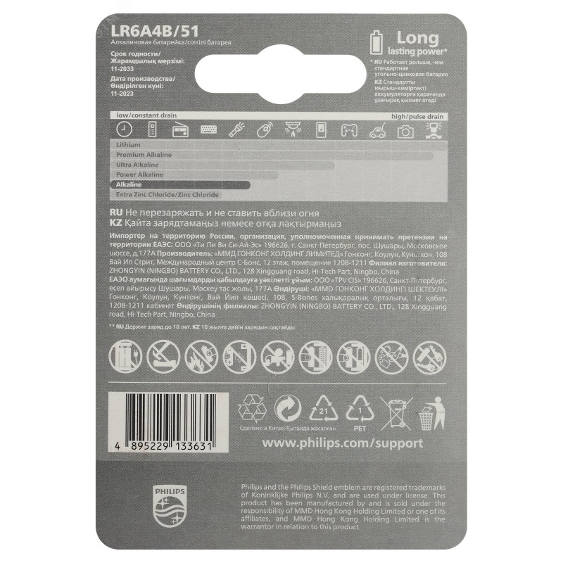 - Преимущества:Отлично подходит для устройств с высоким энергопотреблением|Батарея остается годной для использования в течение 10 лет| Удобство использования|Понятные схематические инструкции по эксплуатации|Щелочные батареи Philips не содержат кадмия, ртути и свинца