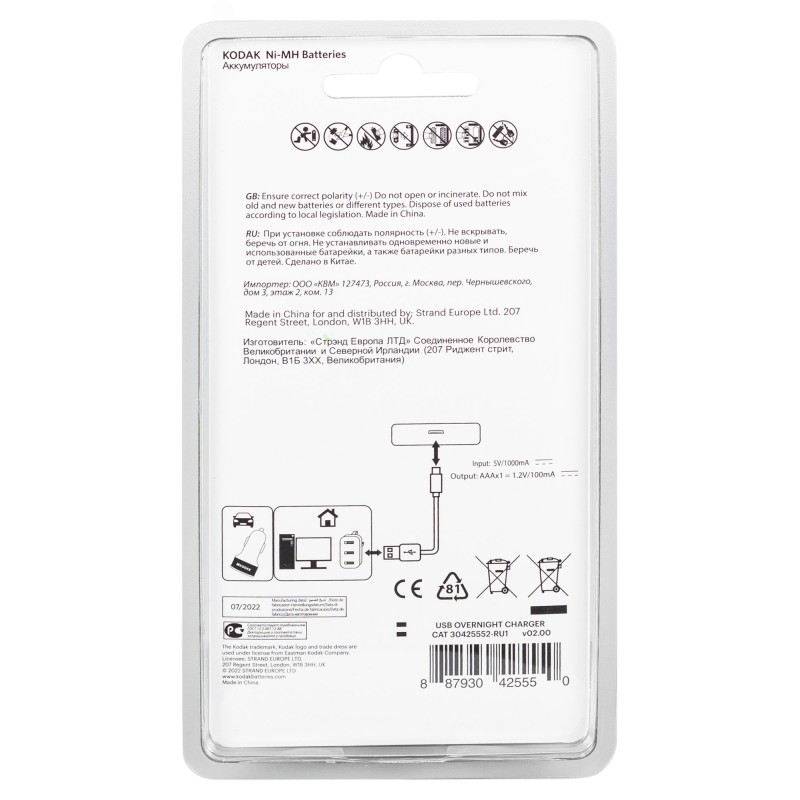 Зарядное устройство для аккумуляторов Kodak USB Overnight charger with 4 x AAA 1100 mAh [K4AA/AAA] (6/48/1008)