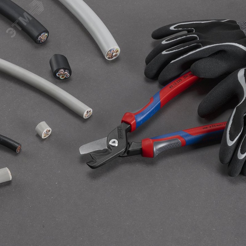 95 12 225 KNIPEX stepcut XL Шарнир с высоким рычажным усилием, длинные рукоятки и оптимизированные режущие кромки – заметно более легкий рез по сравнению с компактными кабельными ножницами. Отличная режущая способность – разрезает одножильные медные или алюминиевые кабели сечением до 35 мм, многожильные кабели сечением до 70 мм и тонкие многожильные кабели сечением до 120 мм. Двойные зоны резки – ступенчатая режущая кромка для удержания кабелей малого и большого размера близко к месту соединения и передняя режущая кромка для поэтапной резки очень больших кабелей. Простое управление одной или двумя руками с минимальным раскрытием рукоятки для кабелей большого диаметра. Регулируемый болтовой шарнир с высоким рычажным усилием обеспечивает точную и плавную резку. Тонкая головка для облегчения доступа. Защита от защемления пальцев. Не подходит для кабелей, армированных сталью, например, сталеалюминиевого провода. Режущие кромки дополнительно закалены лазером