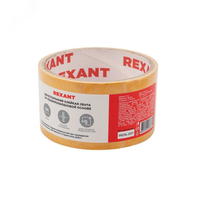 Двухсторонняя клейкая лента 48 мм 5 м REXANT белого цвета на основе полипропилена используется для склеивания гладких поверхностей при проведении оформительских, монтажных, ремонтных и отделочных работ. Высокая прочность клейкой ленты достигается не только благодаря используемому в ней материалу, но и благодаря толщине в 170 мкм. Оптимальная рабочая температура – от -10 до +50 градусов.