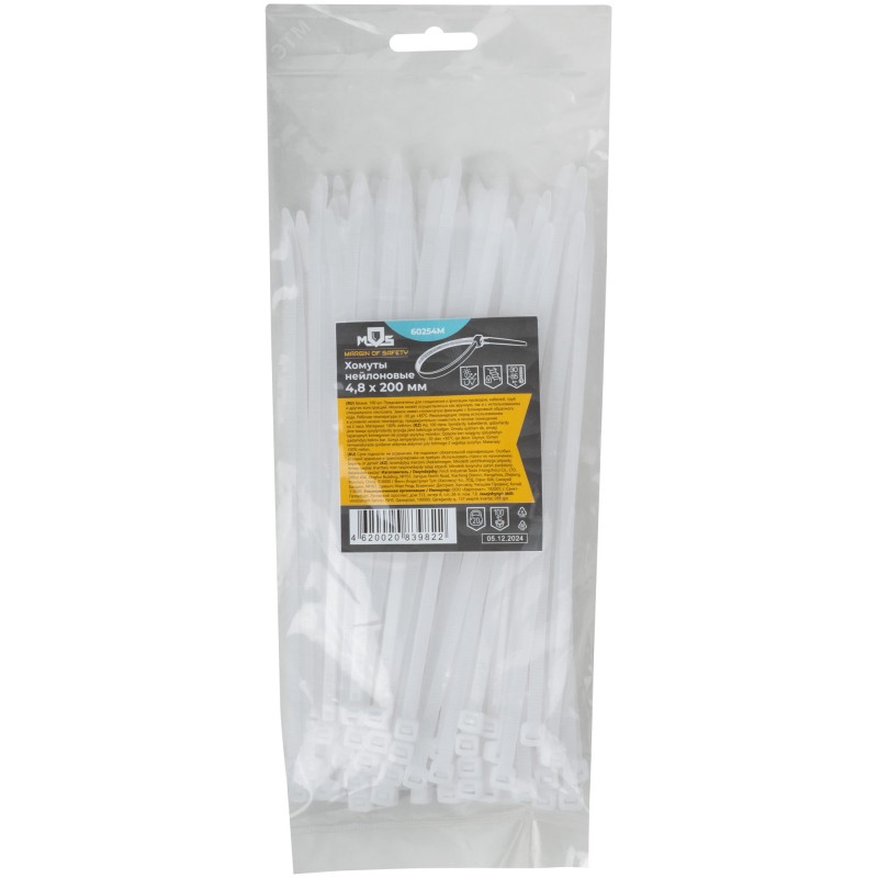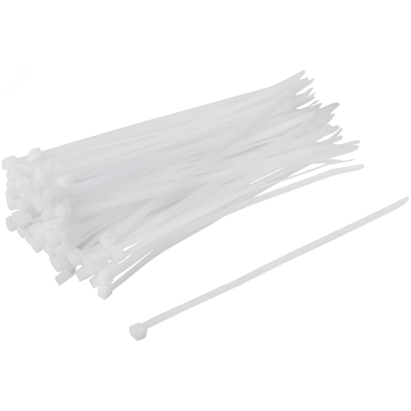 Белые. 100 шт. Предназначены для соединения и фиксации проводов, кабелей, труб и других конструкций. Монтаж может осуществляться как вручную, так и с использованием специального пистолета. Замок имеет ступенчатую фиксацию с блокировкой обратного хода. Материал - нейлон. Упаковка - п/э пакет с подвесом.