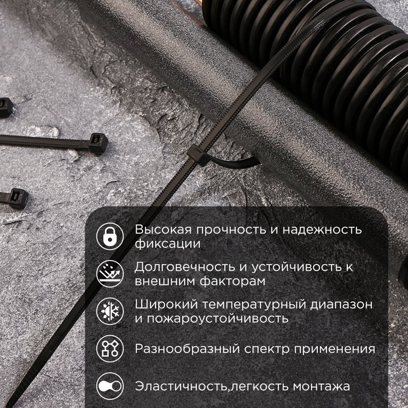 Хомут нейлоновый (кабельная стяжка) 'Тройной замок' предназначен для крепления или обвязки в жгут кабелей и проводов, крепления гибких гофротруб, а также других предметов к несущей поверхности или для соединения между собой. Используется при проведении электромонтажных работ, при монтаже структурированных кабельных систем, для бытовых нужд, а также в других отраслях народного хозяйства. Хомуты 'Тройной замок' упакованы революционным образом — в запаянный пакет ZIP-Lock, который обеспечивает качественное хранение и многоразовое использование после вскрытия. Хомуты нейлоновые 'Тройной замок' гарантируют качество, оперативность и экономичность профессионального электромонтажа, обеспечив максимально надежную фиксацию предметов. Являются эксклюзивной продукцией от REXANT.