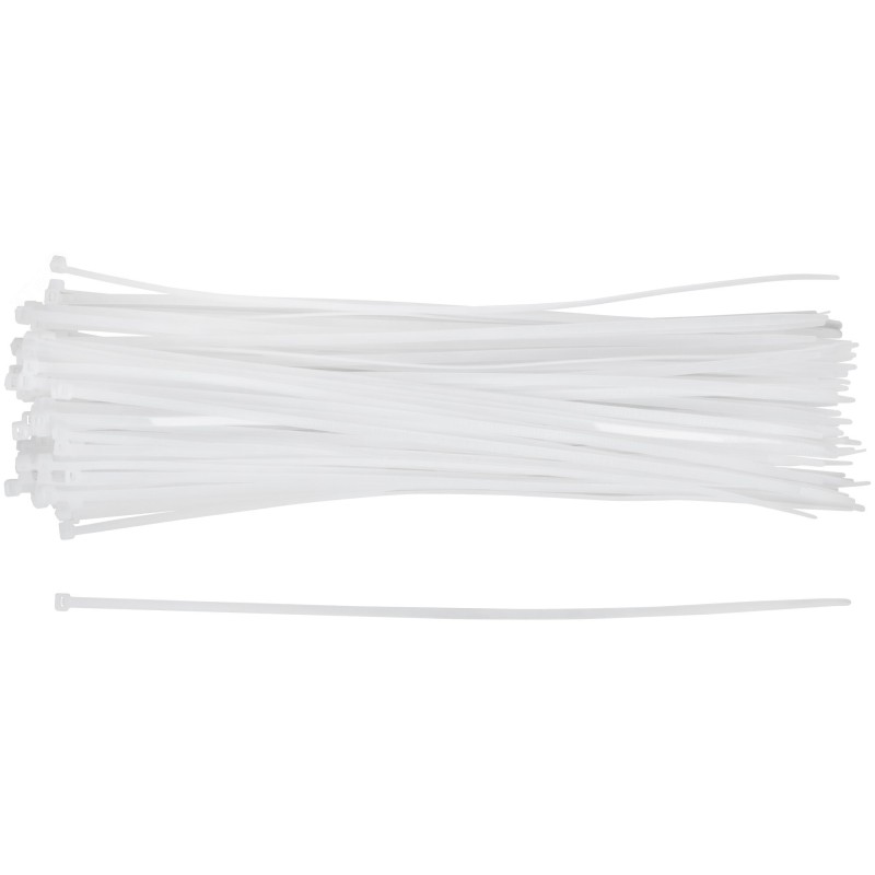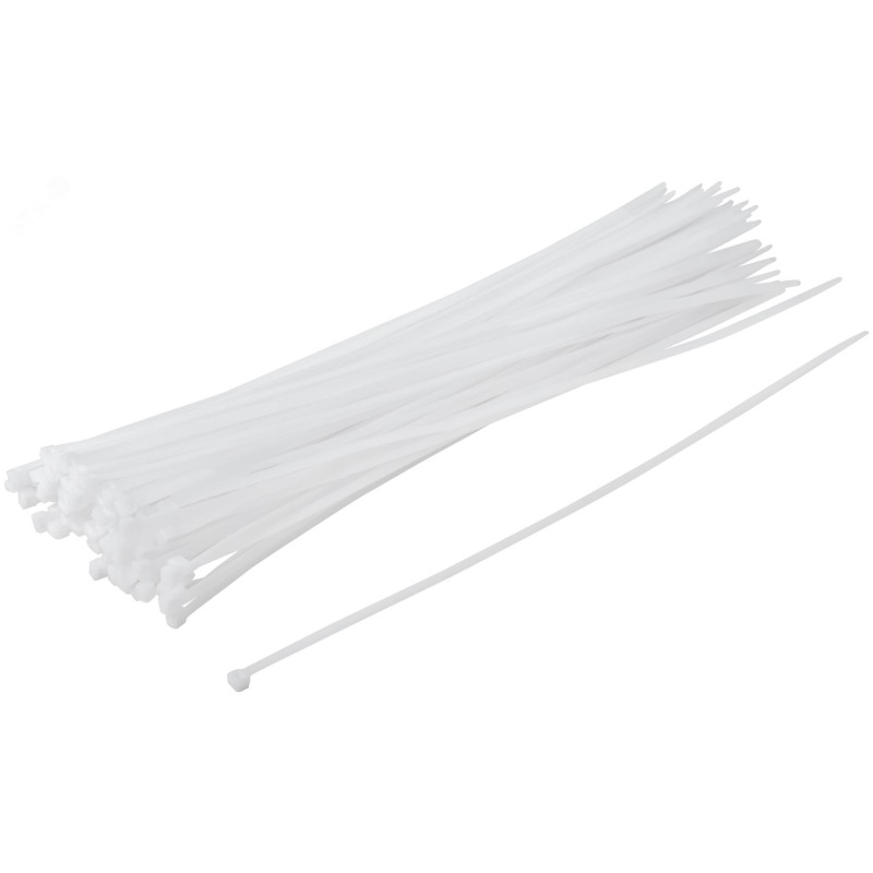 Белые. 100 шт. Предназначены для соединения и фиксации проводов, кабелей, труб и других конструкций. Монтаж может осуществляться как вручную, так и с использованием специального пистолета. Замок имеет ступенчатую фиксацию с блокировкой обратного хода. Материал - нейлон. Упаковка - п/э пакет с подвесом.