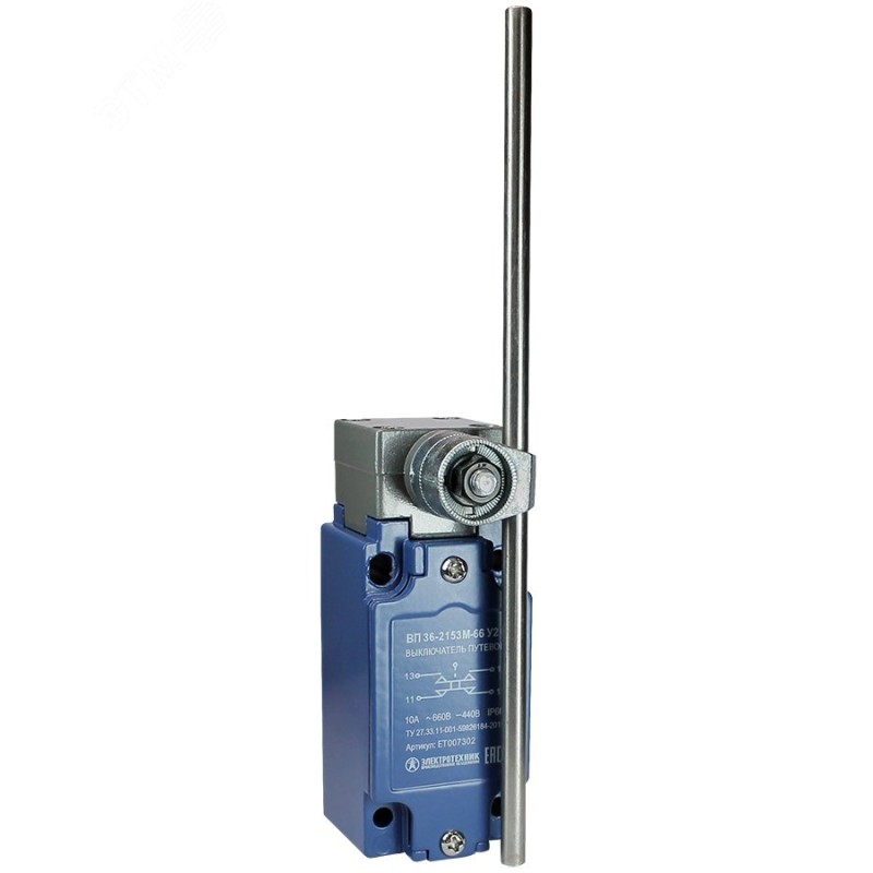 Выключатель путевой ВП 36-2153 М-66 У2, круглый стальной рычаг, регулируемый по длине, 1з+1р, безынерционный, 30х60 мм, без сальника, 3А, IP66
