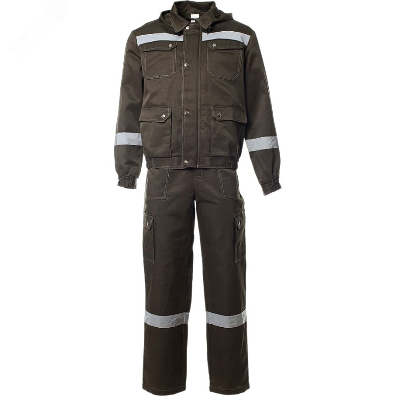 Костюм состоит из куртки и полукомбинезона. Костюм с контрастной отстрочкой. Верх выполнен из смесовой ткани с водоотталкивающей отделкой. Верхние накладные карманы с фигурными клапанами и перекантом на кнопках. Нижние карманы с полуобъемом, с фигурными клапанами и перекантом на кнопках. Укороченная куртка на поясе с частичной стяжкой на эластичной резинке. Имеется съемный капюшон на пуговицах с регулировкой объема по лицевой части. Полукомбинезон с многофункциональными карманами. Эластичная резинка по талии спинки. Гульфик на молнии и застежкой в правом боковом шве. В костюме используется светоотражающая полоса 50 мм.