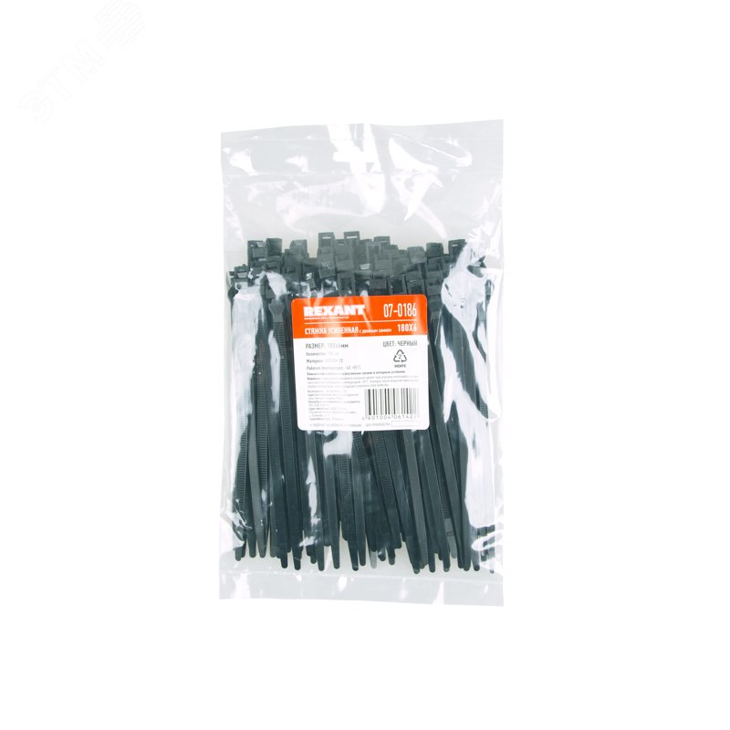 Хомут усиленный с двойным замком nylon 180х6 мм 100 шт., черный REXANT. Предназначен в первую очередь для крепежа и бандажирования кабелей и СИП. Отличается от стандартных стяжек материалом — изготавливается из нейлона-12, за счет чего имеет морозостойкость, большую прочность, стойкость к воздействию агрессивных сред и негативных погодных условий. Также имеет двойной плоский замок, который более компактен в смонтированном виде, по сравнению со стандартными стяжками. Такая особенность позволяет экономить пространство при жгутировании и прокладке нескольких пучков кабеля рядом или в одной трассе, например, в авиационной промышленности.