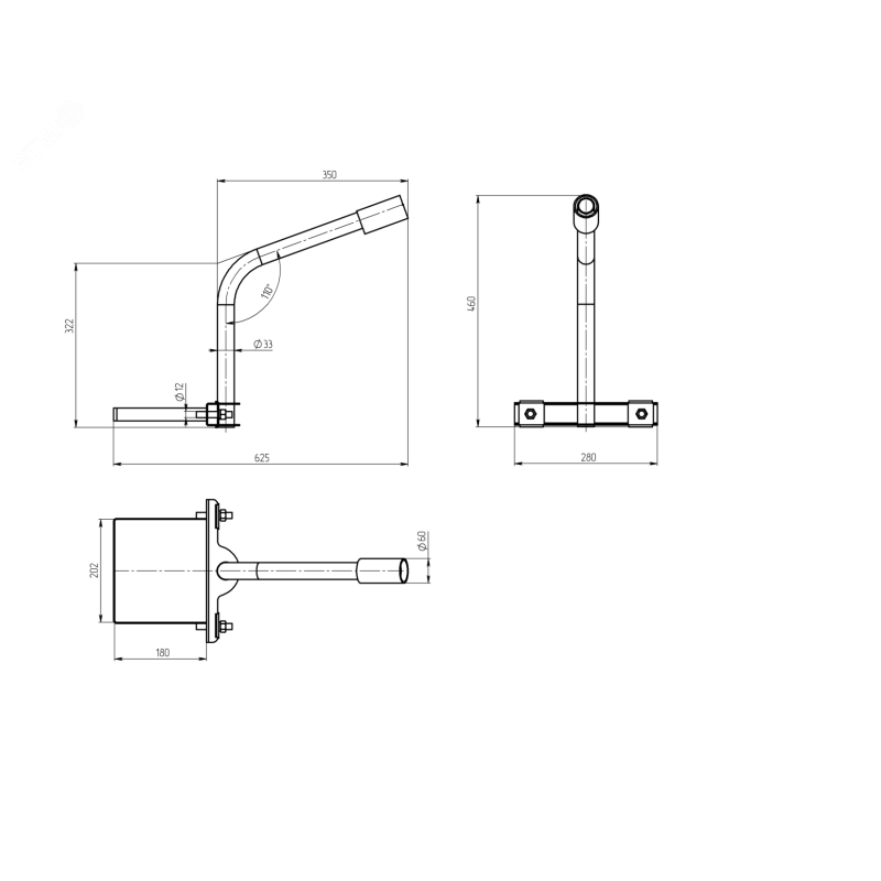 Кронштейн состоит из металлической пластины толщиной 2мм имонтажной трубы для консольного закрепления светильника.Пластина крепится к опоре с помощью П-образной скобы ификсируется на опоре гайками М12. На пластине закрепленаизогнутая труба диаметром 32 мм и толшиной стенки 1,5 мм, наторце трубы зафиксировано посадочное место под светильник,труба d60 и толшиной стенки 1,5 мм длиной 90 мм. Крутящиймомент (момент силы) 75Нм.