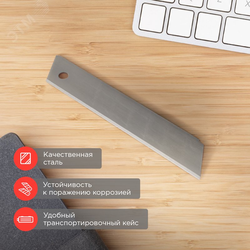Комплект сменных сегментированных лезвий REXANT для ножей арт. 12-4919, арт. 12-4918. Подходят для реза различных материалов- пластика, линолеума, кровельных материалов, гипсокартонных и гипсолитовых плит, бумаги, картона. Лезвия изготовлены из качественной стали, устойчивы к поражению коррозией. Когда крайний сегмент затупляется, его можно отломить и продолжить использовать инструмент. Высокое качество остроты режущей кромки и надежные материалы позволяют использовать лезвия как на производстве, так и в быту. Поставляются в удобном для хранения и транспортировки кейсе.