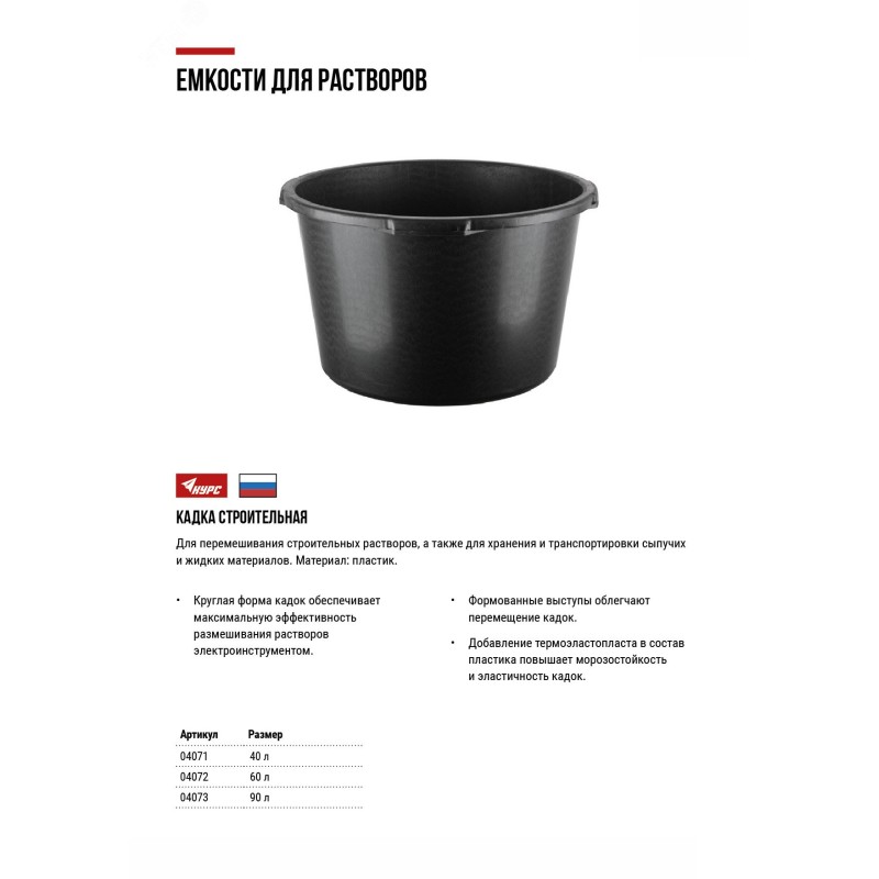 - Преимущества:кругая форма обеспечивает максимальную эффективность размешивания растворов|обладает большой вместимостью|формованные ручки для удобства при транспортировке