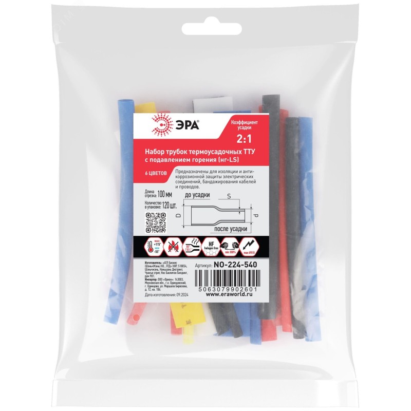 Общепромышленные термоусадочные трубки ТТУ нг-LS в розничных наборах представляют собой универсальное решение для изоляции и маркировки. Трубки изготавливаются методом экструзии из специального состава полиолефина с добавлением антипиренов, после чего нарезаются на отрезки по 10 см. Коэффициент термоусадки 2:1 обеспечивает надежную фиксацию и защиту, а широкая цветовая гамма и разнообразие диаметров позволяют подобрать оптимальный вариант для различных задач. Материал: полиолефин, не поддерживает горение. Рабочее напряжение Ue: 690 B. Температура усадки: +80 / +110 градусов. Температура эксплуатации: -55 / +115 градусов. Относительное удлинение при разрыве: min 300 %. Прочность на растяжение: не менее 15 Мпа. Электрическая прочность: не менее 15 кВ/мм. Не содержит галогенов ''HF - halogen free''