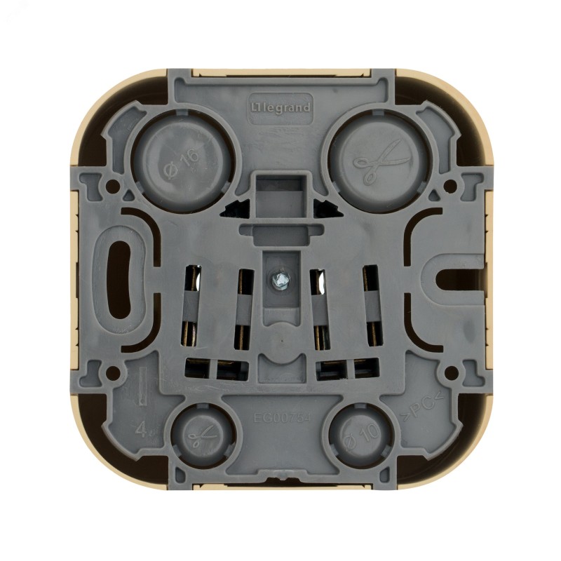 - Преимущества:Современный формат накладного монтажа|Механизм изготовлен из высококачественного поликарбоната, не проводит электрический ток, не поддерживает горение|Простое выравнивание изделий при установке в ряд, благодаря специальной форме основания|Корпус ударопрочный из пластичного полипропилена, стойкого к внешним воздействиям|Перфорация на корпусе для безошибочного вырезания отверстий при монтаже открытой проводки|В основании преднарезаны 4 отверстия для подвода кабеля при монтаже скрытой проводки