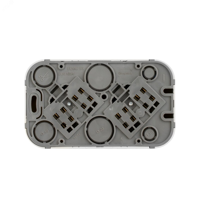 - Преимущества:Современный формат накладного монтажа|Механизм изготовлен из высококачественного поликарбоната, не проводит электрический ток, не поддерживает горение|Простое выравнивание изделий при установке в ряд, благодаря специальной форме основания|Корпус ударопрочный из пластичного полипропилена, стойкого к внешним воздействиям|Перфорация на корпусе для безошибочного вырезания отверстий при монтаже открытой проводки|В основании преднарезаны 4 отверстия для подвода кабеля при монтаже скрытой проводки