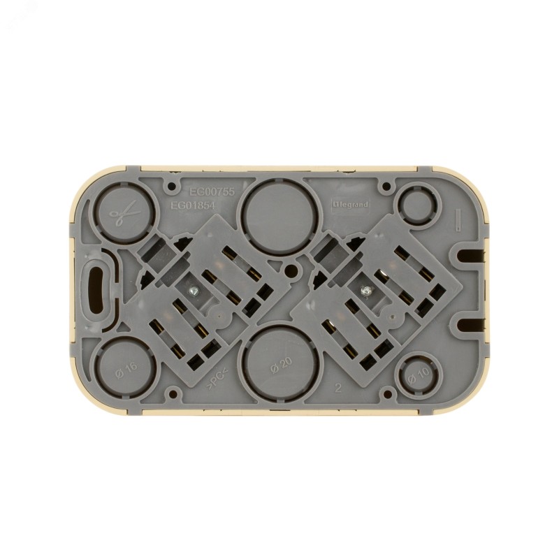 - Преимущества:Современный формат накладного монтажа|Механизм изготовлен из высококачественного поликарбоната, не проводит электрический ток, не поддерживает горение|Простое выравнивание изделий при установке в ряд, благодаря специальной форме основания|Корпус ударопрочный из пластичного полипропилена, стойкого к внешним воздействиям|Перфорация на корпусе для безошибочного вырезания отверстий при монтаже открытой проводки|В основании преднарезаны 4 отверстия для подвода кабеля при монтаже скрытой проводки