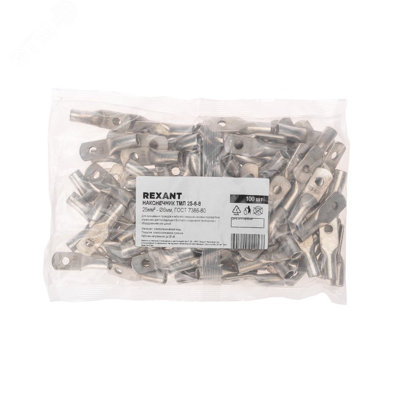 Наконечник ТМЛ 25-6-8 REXANT предназначен для оконцевания проводов и кабелей с медными и алюминиевыми жилами посредством опрессовки для последующего болтового соединения проводника с оборудованием или шиной. Структура обозначения - Т - Труба - полуфабрикат, из которого изготовлен наконечник. М - Медь - материал, из которого изготовлен наконечник. Л - Луженый - покрытие. 25 - номинальное сечение наконечника, мм.кв. 6- диаметр контактного стержня, мм. 8- внутренний диаметр хвостовика, мм.