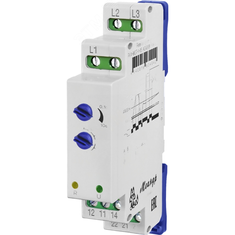 Реле контроля трехфазного напряжения предназначено для контроля трехфазного линейного напряжения в сетях с изолированной нейтралью. Реле контролирует порядок чередования фаз, обрыв и 'слипание' фаз, превышение напряжения выше и снижение напряжения ниже установленного порога. Реле выпускаются в унифицированном пластмассовом корпусе с передним присоединением проводов питания и коммутируемых электрических цепей. Крепление осуществляется на монтажную рейку DIN EN 50022 или на ровную поверхность. Для установки реле на ровную поверхность пружины замков необходимо переставить в крайние отверстия, фиксирующие пружину замка, которые расположены на тыльной стороне корпуса. Конструкция клемм обеспечивает надежный зажим проводов сечением до 2.5 мм2. На лицевой панели прибора расположены регулятор порога на снижение и превышение напряжения, регулятор времени срабатывания, а также зеленый индикатор включения питания 'U' и желтый индикатор срабатывания встроенного исполнительного реле 'R'.