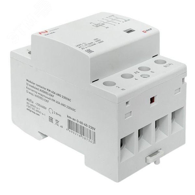 - Комплектация:контактор модульный КМ 40А 4NO 230В АС (3 мод.) AVERES EKF