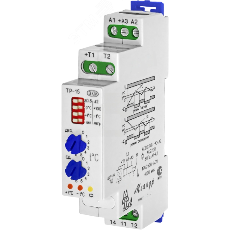 Температурное реле предназначено для контроля и поддержания заданного температурного режима по сигналам датчика температуры в помещениях, овощехранилищах, системах водяного отопле- ния, охлаждающих систем, жидкостей, предметов и т. п., а также для использования в качестве комплектующего изделия в устройствах автоматики. Конструкция Реле выпускаются в унифицированном пластмассовом корпусе с передним присоединением проводов питания и коммутируемых электрических цепей. Крепление осуществляется на монтажную шину DIN или на ровную поверхность. Для установки реле на ровную поверхность, фиксаторы замков необходимо переставить в крайние отверстия, расположенные на тыльной стороне корпуса. Конструкция клемм обеспечивает надежный зажим проводов сечением до 2,5 мм2.