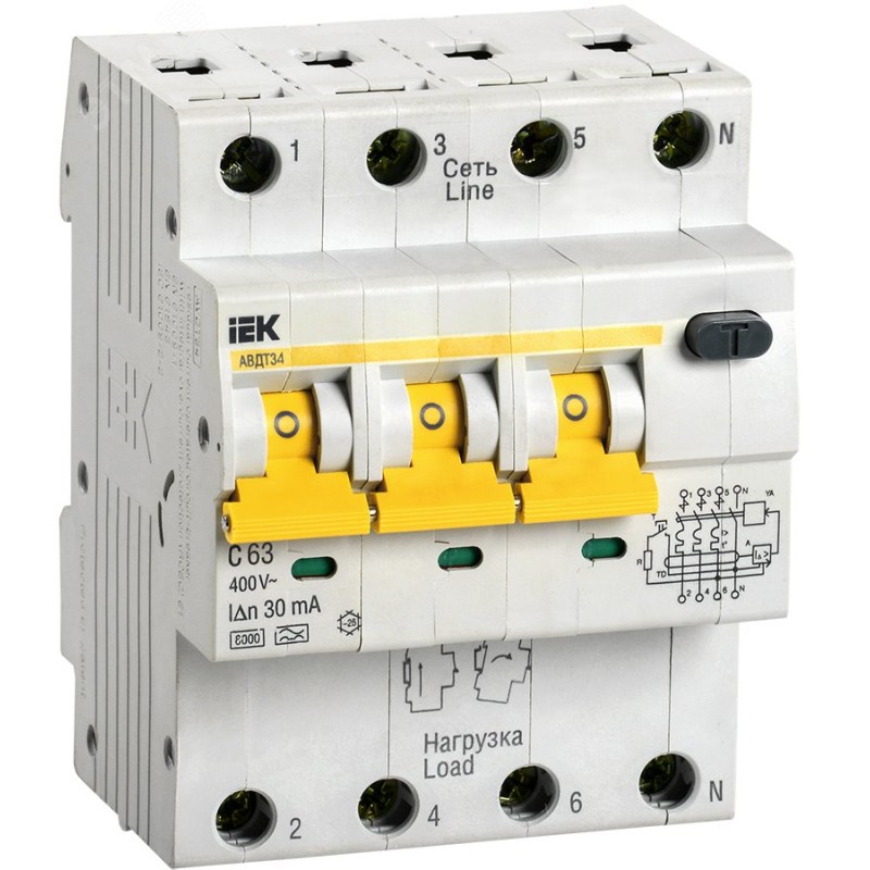Автоматические выключатели дифференциального тока предназначены для защиты человека от поражения электрическим током при повреждении изоляции электроустановок, для предотвращения пожаров вследствие протекания токов утечки на землю и для защиты от перегрузки и короткого замыкания в сетях переменного тока. Преимущества: Компактная конструкция автоматического выключателя. Номинальный условный ток короткого замыкания 6000 А позволяет устанавливать АВДТ34 в качестве вводных автоматов защиты. Индикатор положения контактов. Насечки на контактных зажимах снижают тепловые потери и увеличивают механическую прочность соединения. Эргономичная кнопка ТЕСТ для проверки работоспособности устройства и правильности подключения. Главные контакты АВДТ34 сконструированы так, что нейтральный контакт замыкается раньше и отключается позже, что позволяет избежать перекоса фаз напряжения нагрузки.