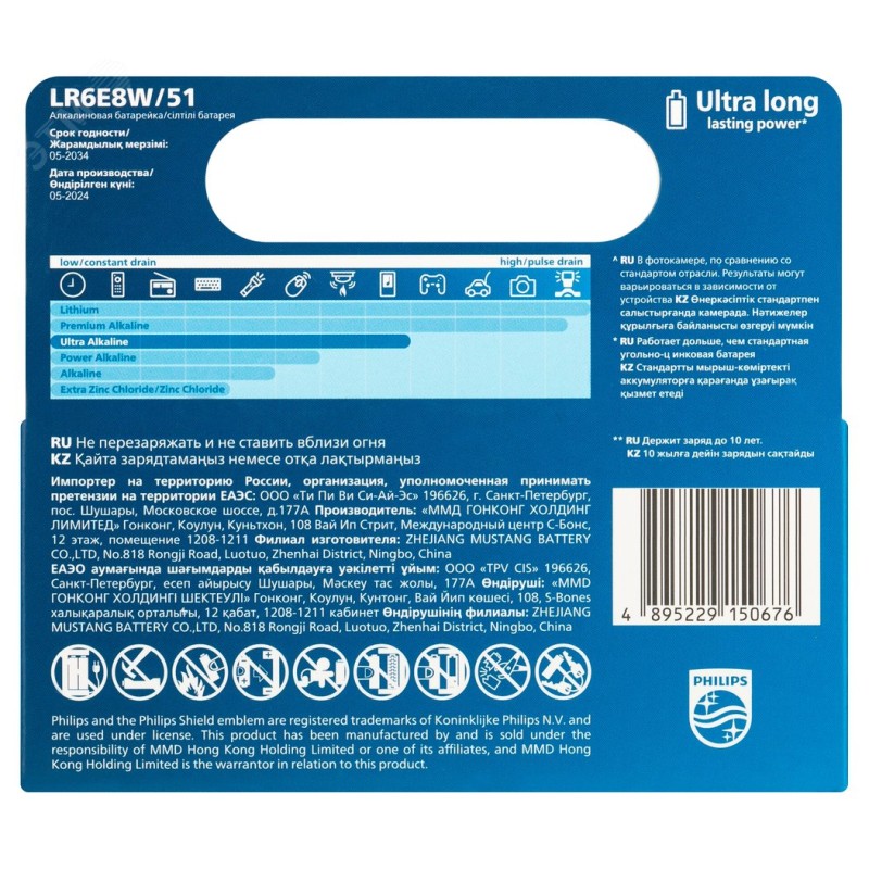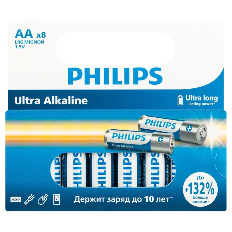 - Преимущества:Отлично подходит для устройств с высоким энергопотреблением|Цветная маркировка облегчает определение размеров элементов питания|Понятные схематические инструкции по эксплуатации|Не наносит вреда окружающей среде|Щелочные батарейки Philips не содержат кадмий, ртуть и свинец|Сохраняет заряд до 10 лет |Мощность на 129 % превышает отраслевые стандарты