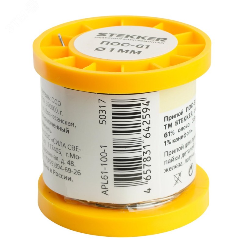APL61-100-1 Припой ПОС-61 с канифолью в бобине 100 гр. Припой ПОС представляет собой сплаволова со свинцом. Цифра обозначает процентное содержание олова. Олово 61%, свинец: 38%, канифоль 1%. Температура плавления: 183-190 градусов Цельсия. Припой используется для соединения металлов в процессе пайки. Чаще всего применяется в радиоэлектронике и при лужении проводов.