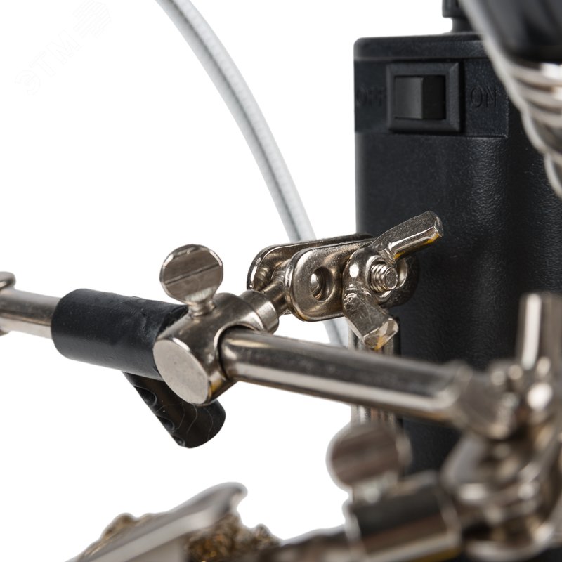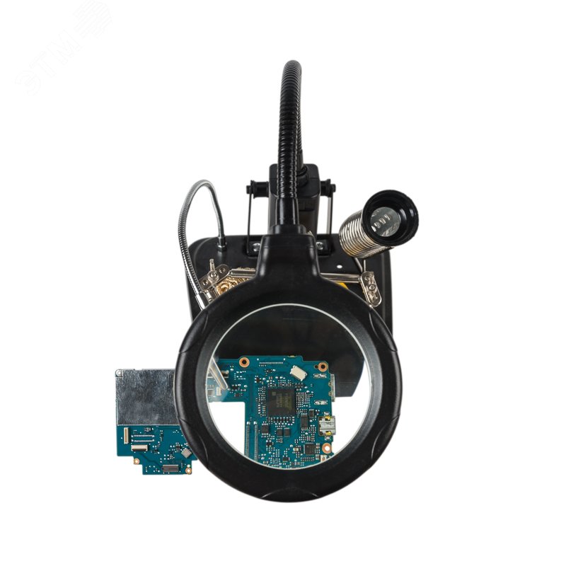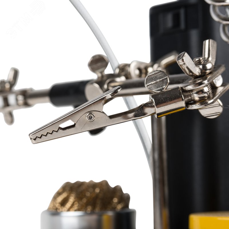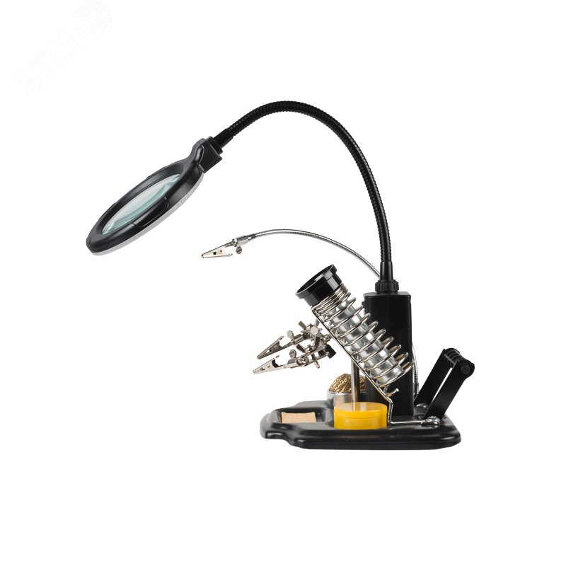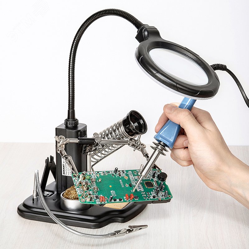 Держатель третья рука ПРОФИ с лупой х3, подставка под паяльник, LED подсветка, стенд для припоя REXANT служит главным образом при проведении паяльно-сборочных работ в электронике, ювелирном деле, сборке и ремонте для зажима мелких деталей в любом нужном положении, когда не хватает двух рук. Инструмент состоит из – основания, двух подвижных зажимов на трубке типа крокодил с никелевым покрытием, зажима на длинной регулируемой стойке с никелевым покрытием, лупы с LED подсветкой (возможность регулировки положения), спиралевидной подставки под паяльник с никелевым покрытием, держателя припоя на катушках. LED подсветка интегрирована в держатель линзы и дает возможность работать в помещениях с плохой освещенностью. С помощью лупы можно будет рассмотреть даже самые мелкие детали. Линза изготовлена из стекла, что обеспечит наиболее четкое изображение с минимальным уровнем искажений.
