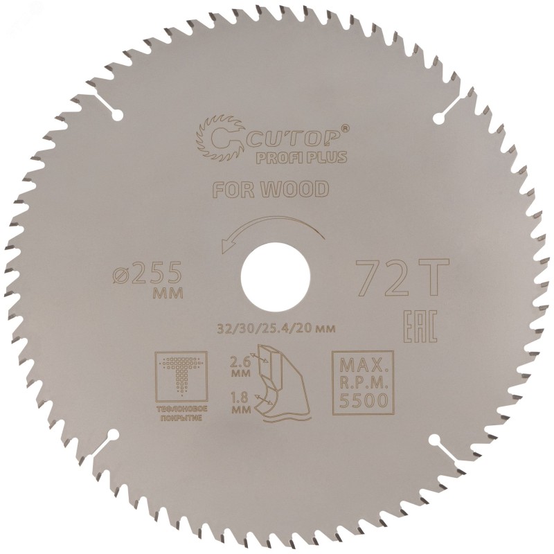 Диск пильный по дереву Cutop Profi Plus с тефлоновым покрытием. Используется совместно с циркулярными и торцовочными пилами для продольного и поперечного реза. Предназначен для распила мягких и твердых пород древесины, МДФ, фанеры и др. В комплекте поставляются переходные кольца с посадочными диаметрами (диаметры указаны на диске). Диск имеет тефлоновое покрытие и компенсационные пазы, которы способствуют быстрому теплоотводу. Благодаря этому рез получается ровный, а диск не деформируется и имеет более длительный срок службы. Изготавливаются диски в специальной автоматической индукционной машине, которая обеспечивает более гладкую поверхность и острые зубья. Материал - инструментальная сталь, карбидные зубья. Упаковка - блистер.