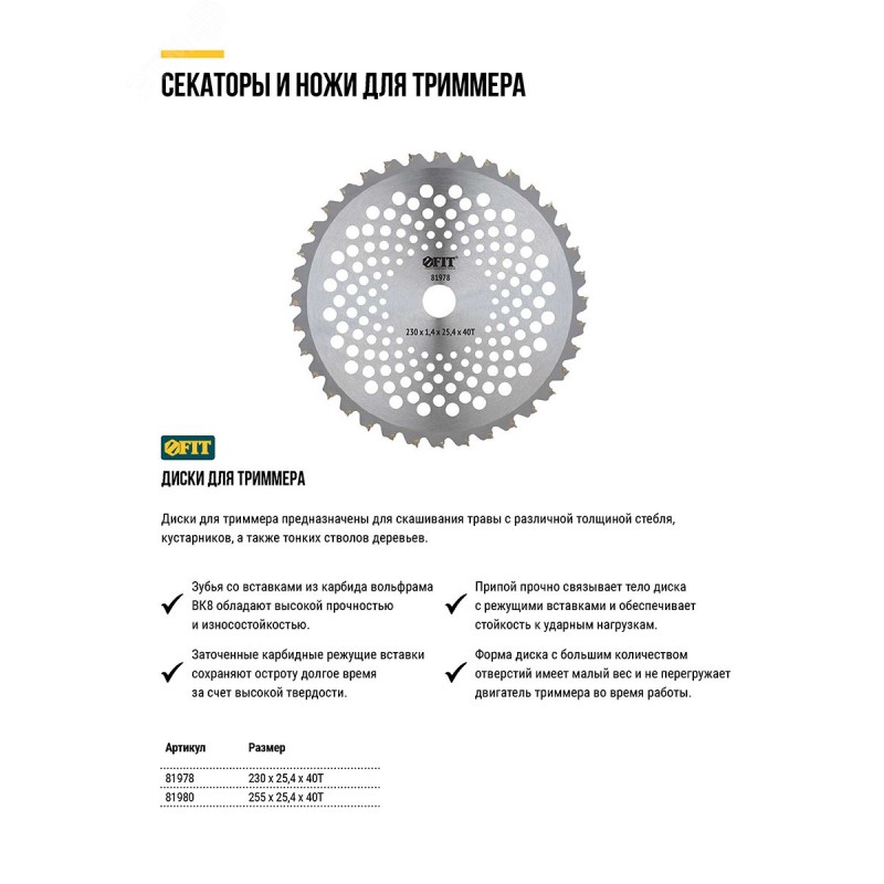 Для скоса и измельчения травы, кустарников и тонких стволов деревьев. Посадочный диаметр 25,4 мм. Толщина режущей кромки 1,3 мм. Материал - инструментальная сталь, карбидные режущие вставки. Упаковка - картонный конверт.